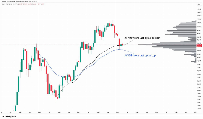 Según el analista Cantonese Cat en X, hay argumentos bastante convincentes para el soporte en los 67.000 dólares. Al observar el gráfico de futuros de la CME, los VWAP anclados tanto del mínimo como del máximo del ciclo anterior se encuentran justo en esta zona, casi apilados. El volumen muestra una intensa negociación pasando esa zona. Lo que significa que se dirige a un punto donde compradores y vendedoras ya se han enfrentado.