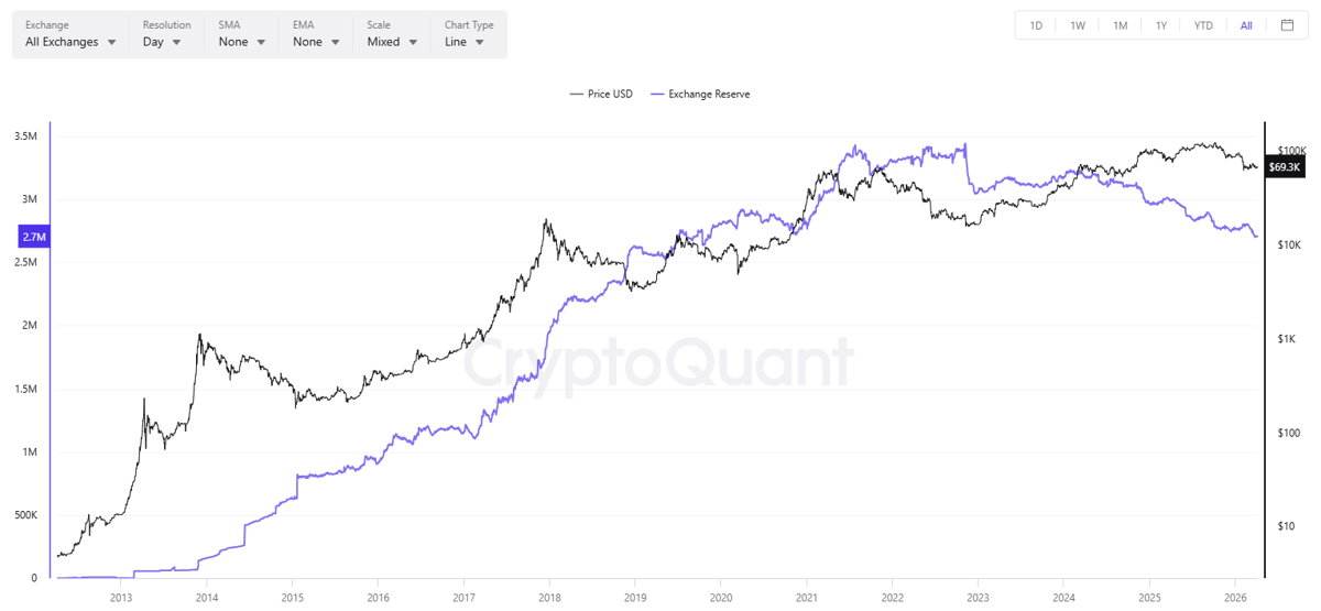 La cantidad de monedas almacenadas en plataformas centralizadas cayó a un mínimo de siete años hacia finales de marzo y, al momento de redactarse este artículo, se mantiene muy cerca de ese nivel.