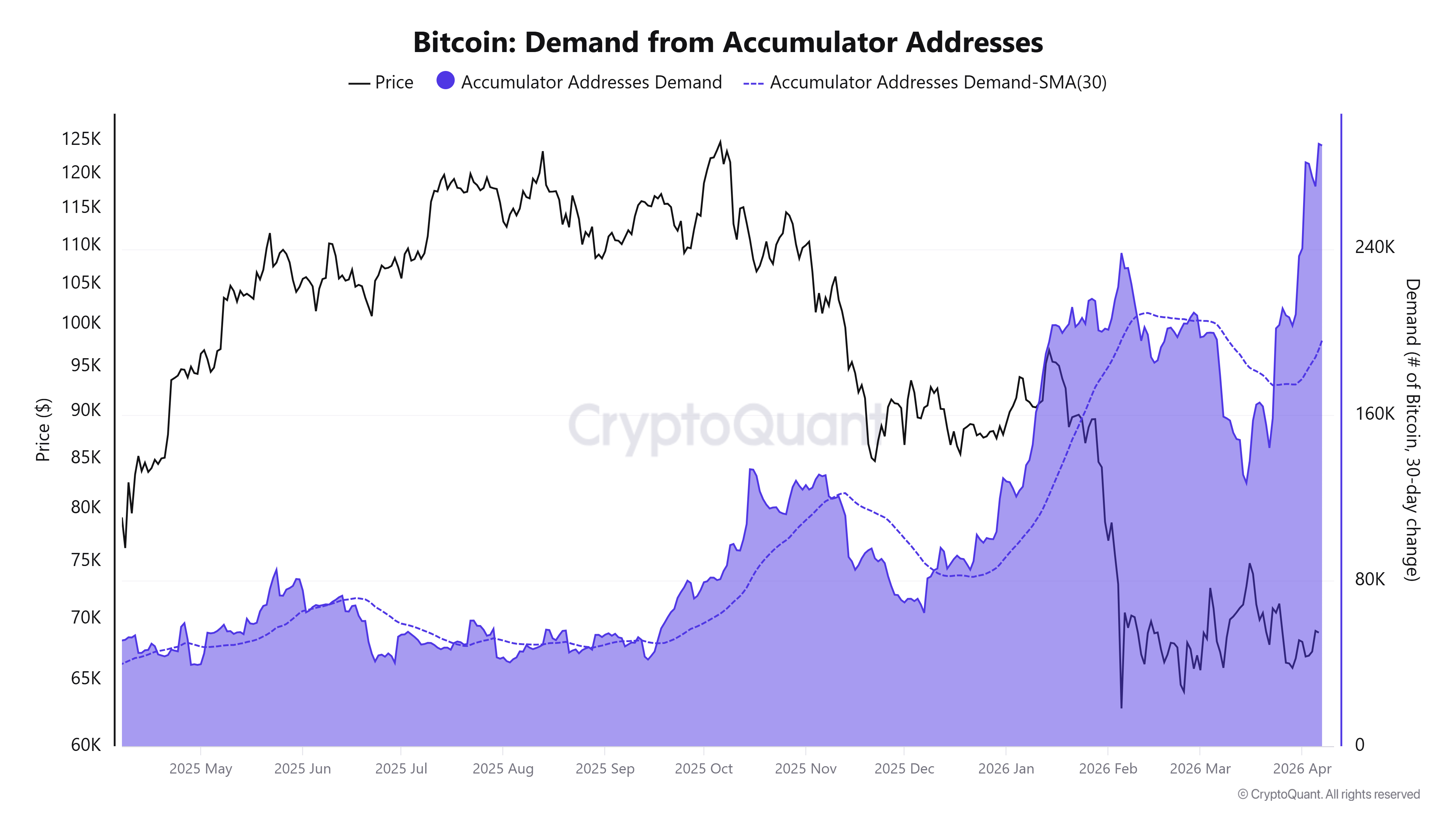 La demanda de direcciones acumuladoras respaldó esta tendencia. Datos de CryptoQuant indican que la demanda de monederos a largo plazo subió a 289.971 $BTC el 7 de abril, desde 158.336 $BTC en las dos semanas anteriores, es decir, un aumento del 83%.