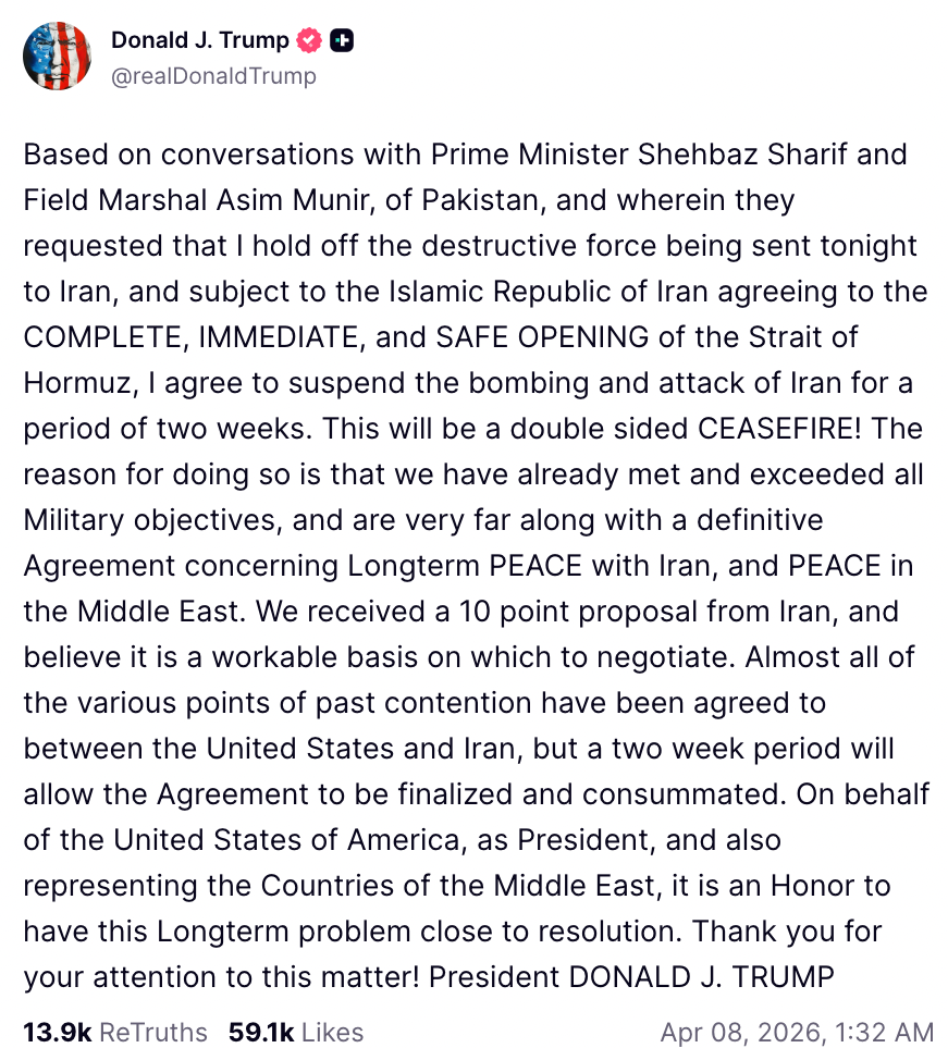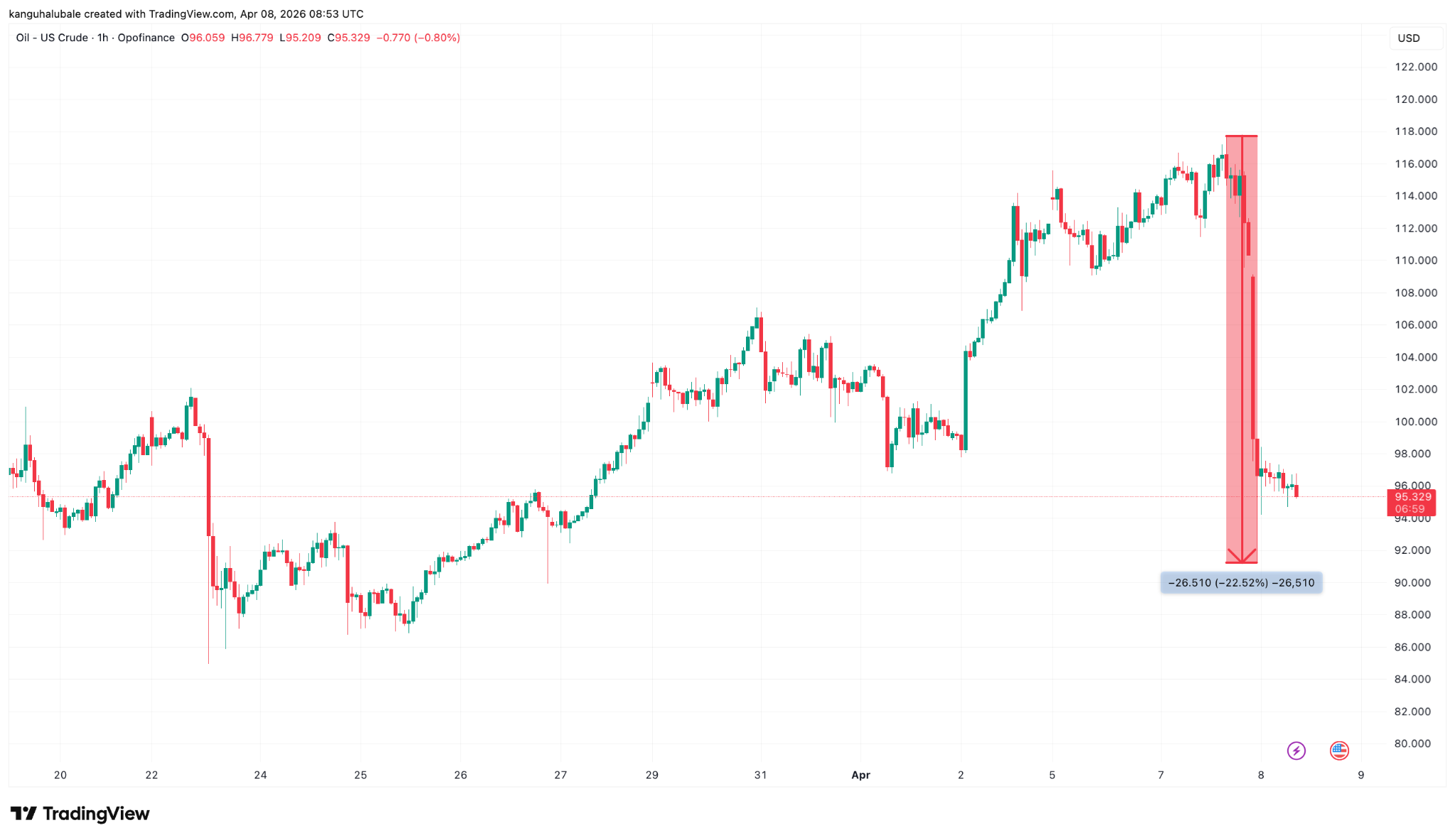El precio reaccionó a la confirmación de Trump del acuerdo de alto el fuego de dos semanas con Irán, condicionado a la "apertura completa, inmediata y segura" del Estrecho de Hormuz.