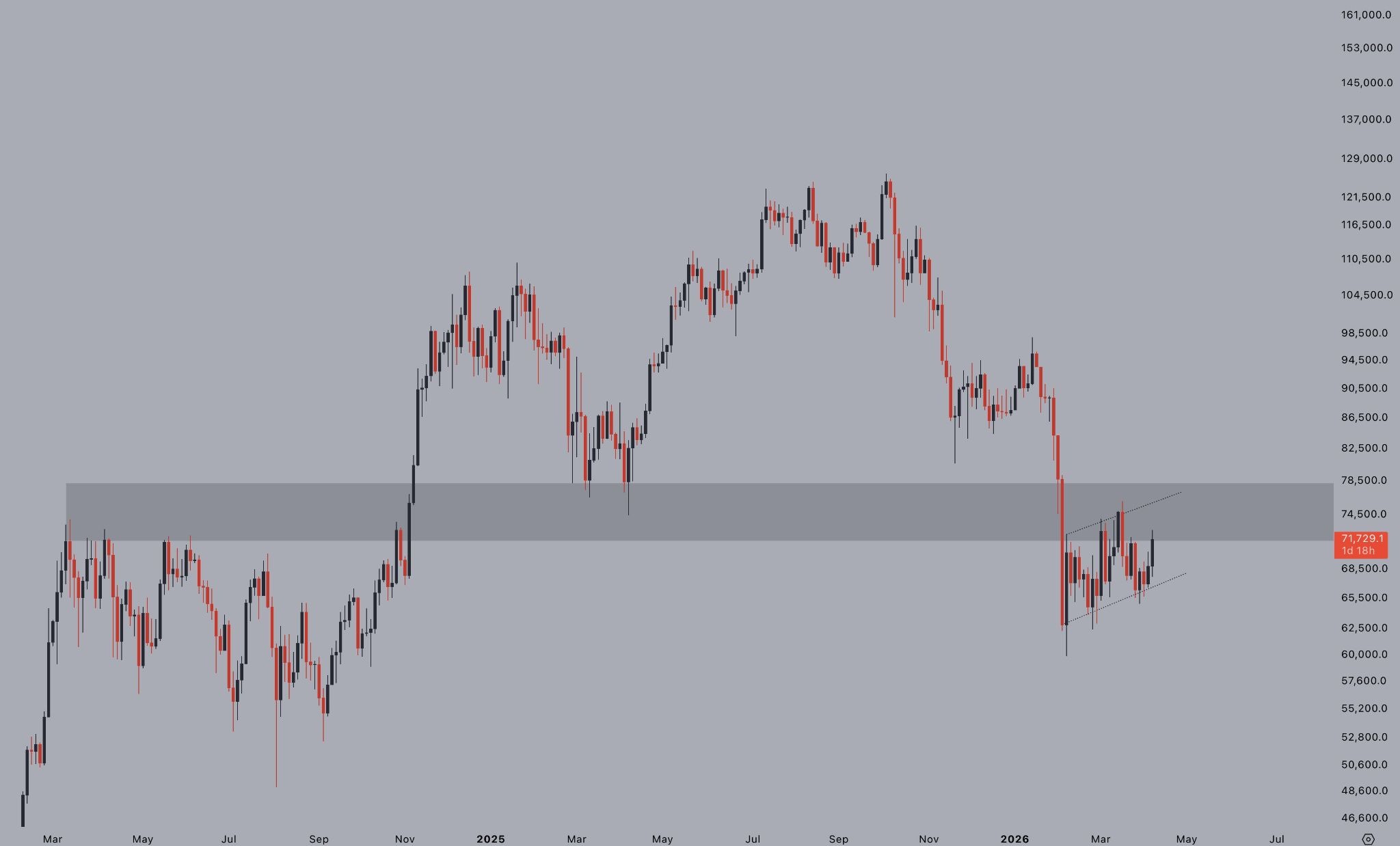 Los traders señalan que el precio de Bitcoin debe romper de manera decisiva el rango de USD 72.000-76.000 para confirmar un cambio de tendencia.