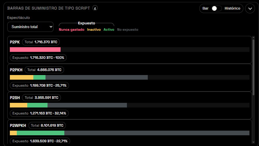 El desglose por tipo de dirección muestra diferencias significativas en el nivel de exposición. Las direcciones P2PK (Pago a Clave Pública), correspondientes a la era Satoshi y las más antiguas de la red, tienen el 100% de sus 1.716.320 $BTC expuestos.