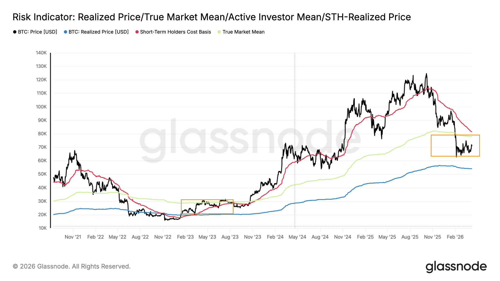 El indicador de riesgo de Glassnode revela una resistencia importante entre la media real del mercado en 78.000 dólares y el nivel de coste base de los holders a corto plazo alrededor de 80.000 dólares.