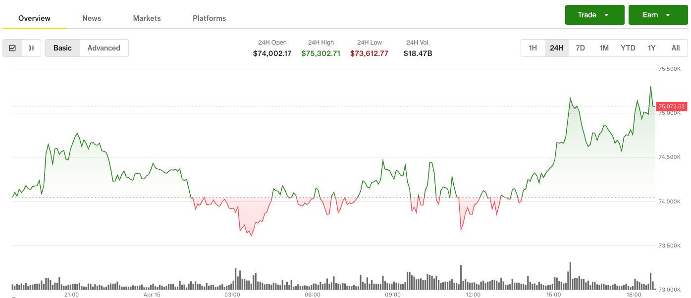 Operando recientemente alrededor de $75,134, bitcoin subió un 1.45% en las últimas 24 horas, según datos de CoinDesk.