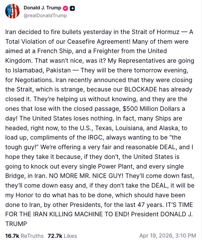 “Mis representantes van a Islamabad, Pakistán — Estarán allí mañana por la noche, para negociaciones”, escribió en una publicación en Truth Social el domingo.