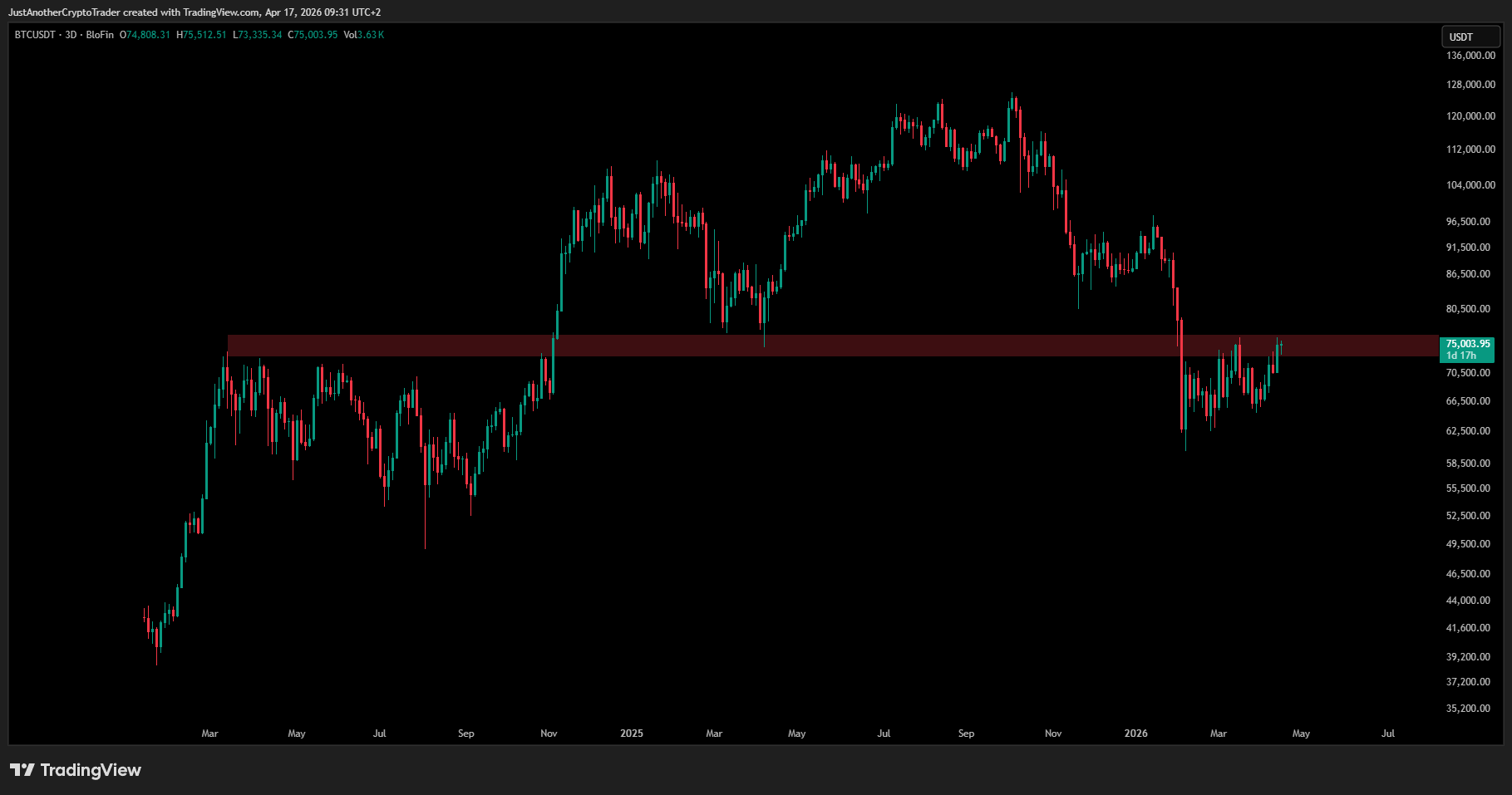 Datos de TradingView mostraron ganancias diarias de 2,5% para $BTC/USD, que había cerrado la semana por debajo de USD 74.000.