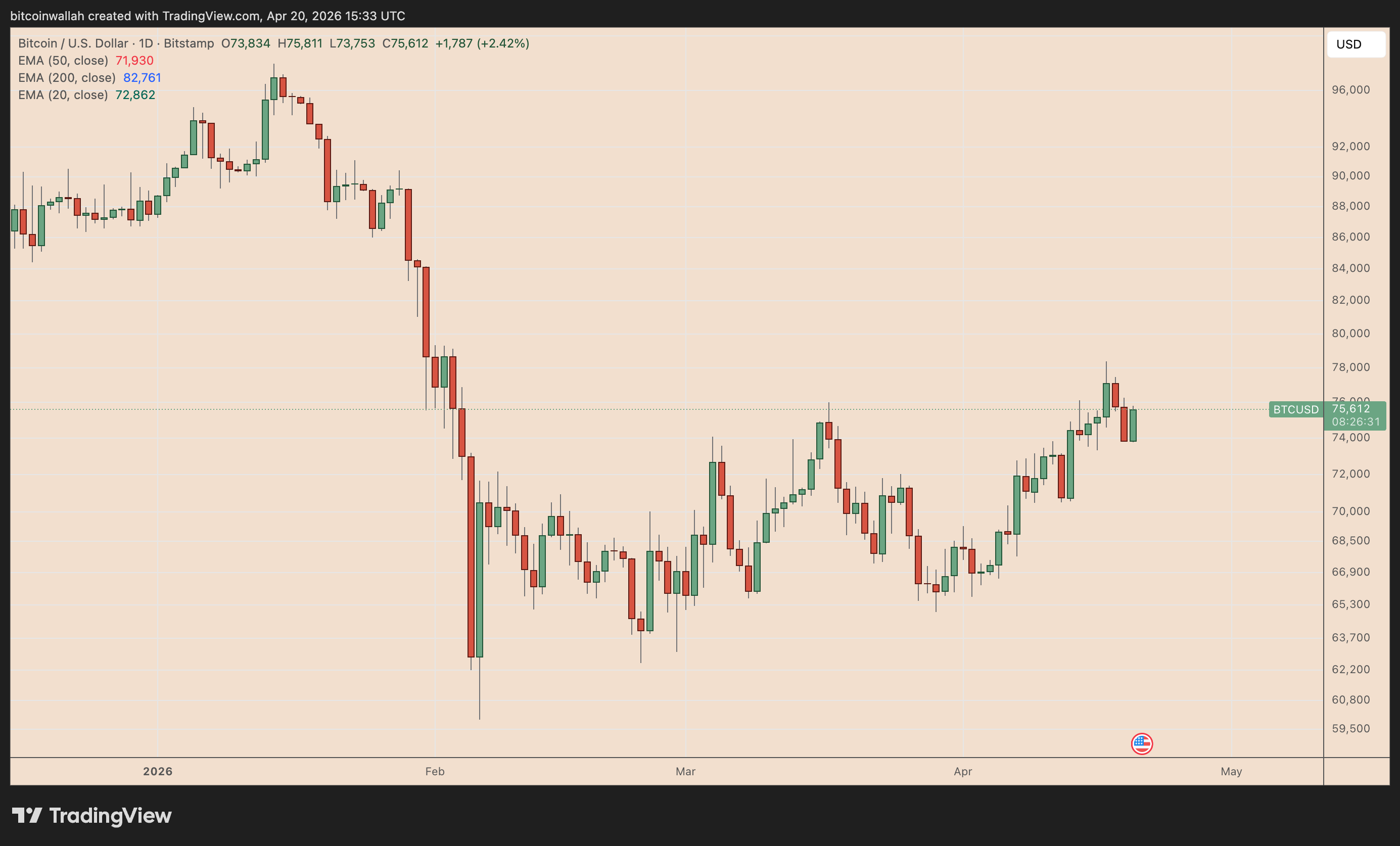 Bitcoin ($BTC) subió un 2,66% a alrededor de 75.800 dólares el lunes después de que Strategy reveló una compra de 2.540 millones de dólares, la tercera mayor compra de la compañía y equivalente a aproximadamente 2,5 meses de nueva oferta de $BTC.