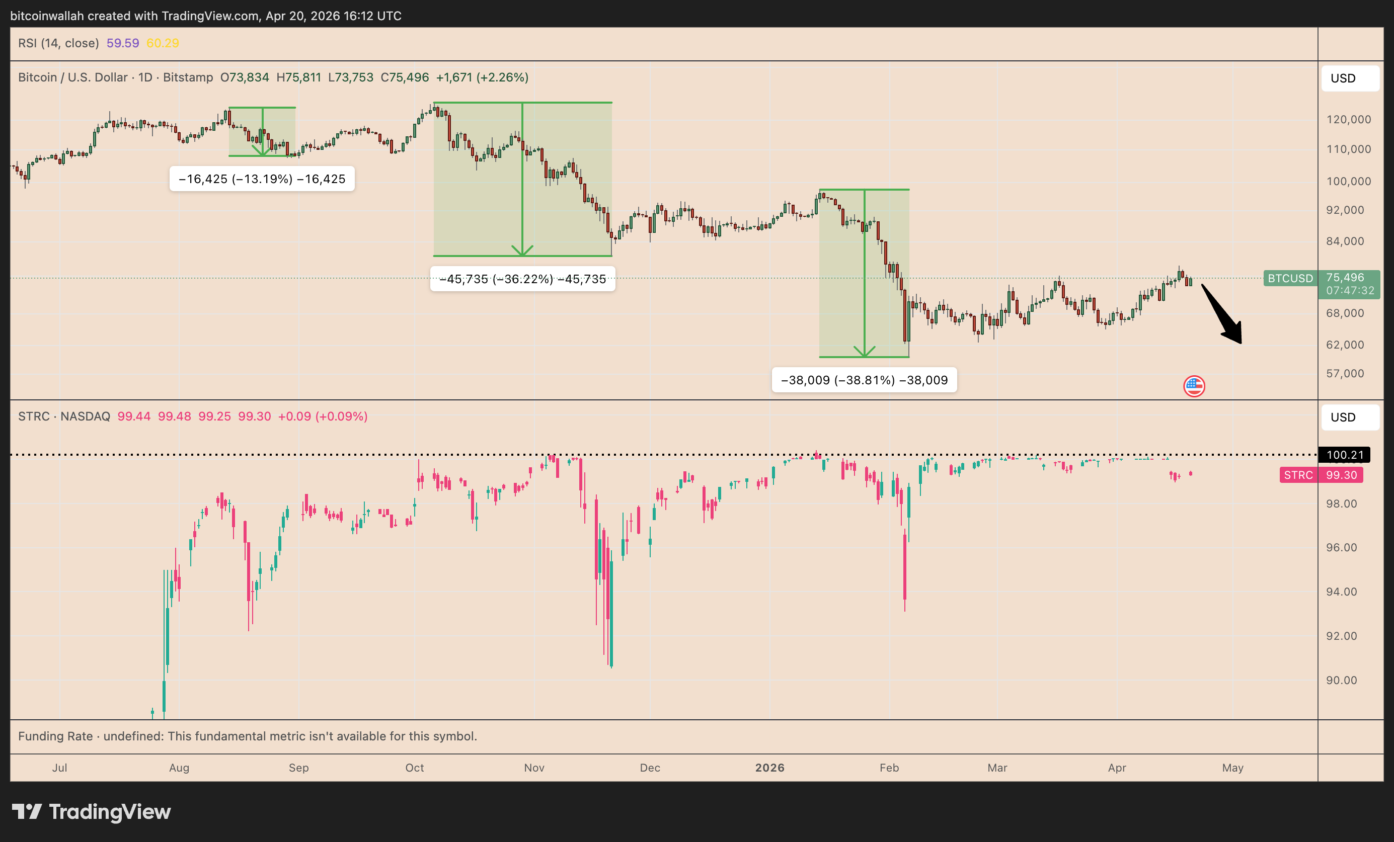 Por ejemplo, en promedio, el precio de $BTC ha caído alrededor de un 30% cuando STRC cotizó por debajo de su valor nominal de 100 dólares.
