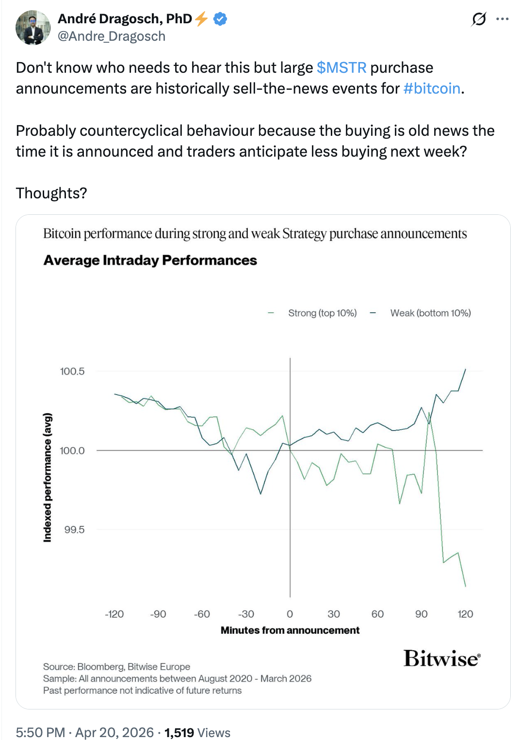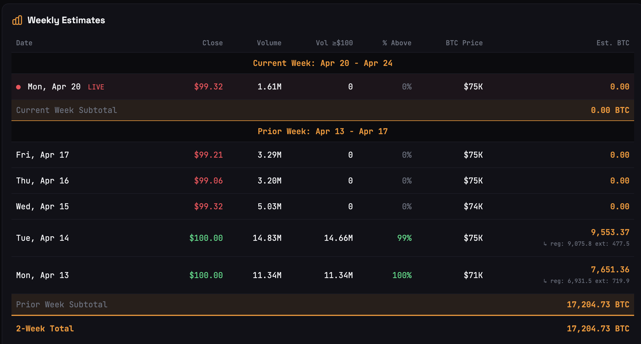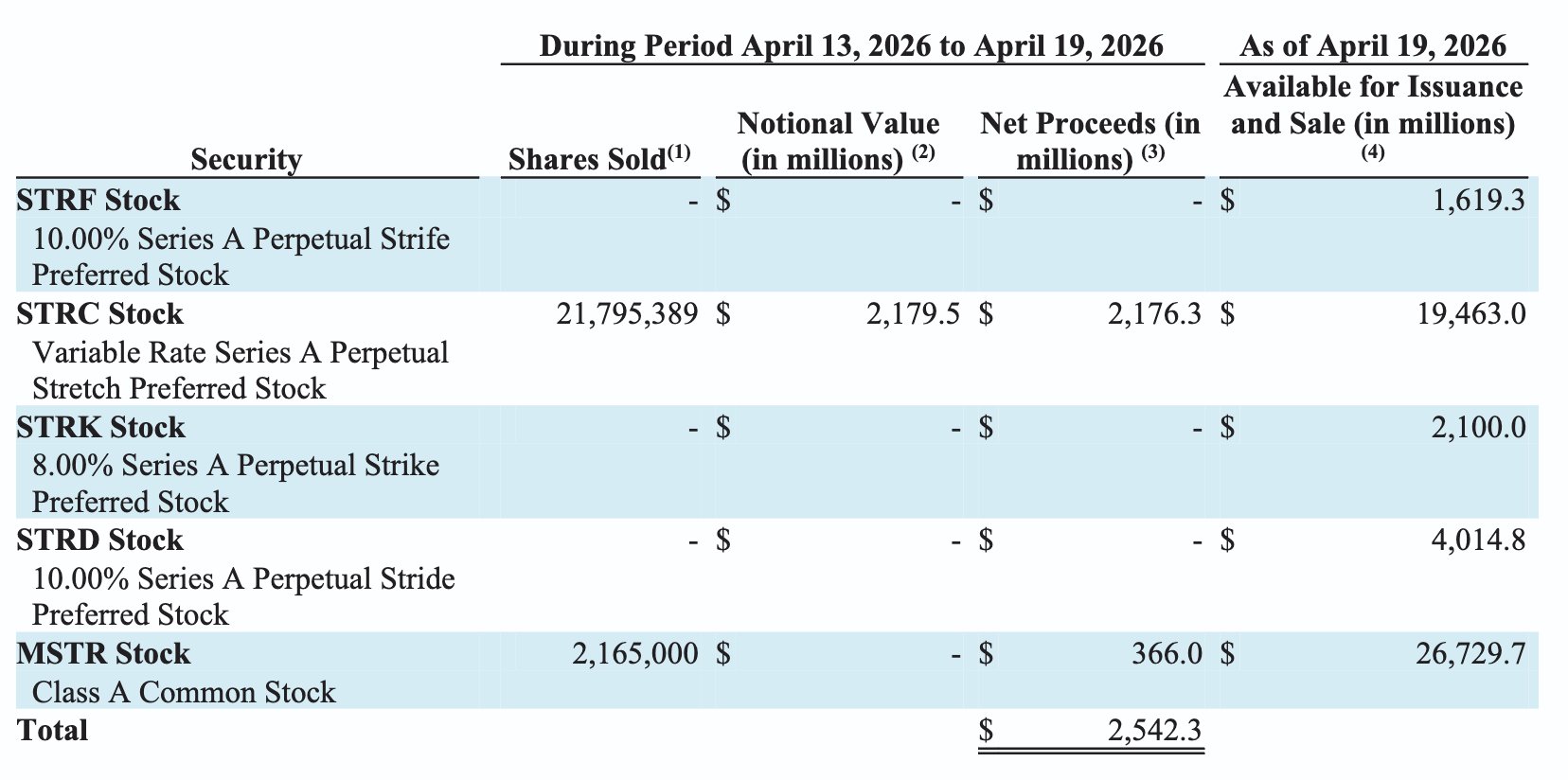 Strategy financió la mayor parte de su última compra de 34.164 $BTC a través de sus acciones preferentes, Stretch (STRC), que generó más de 2.170 millones de dólares a través de ventas de acciones en el mercado entre el 13 y el 19 de abril.