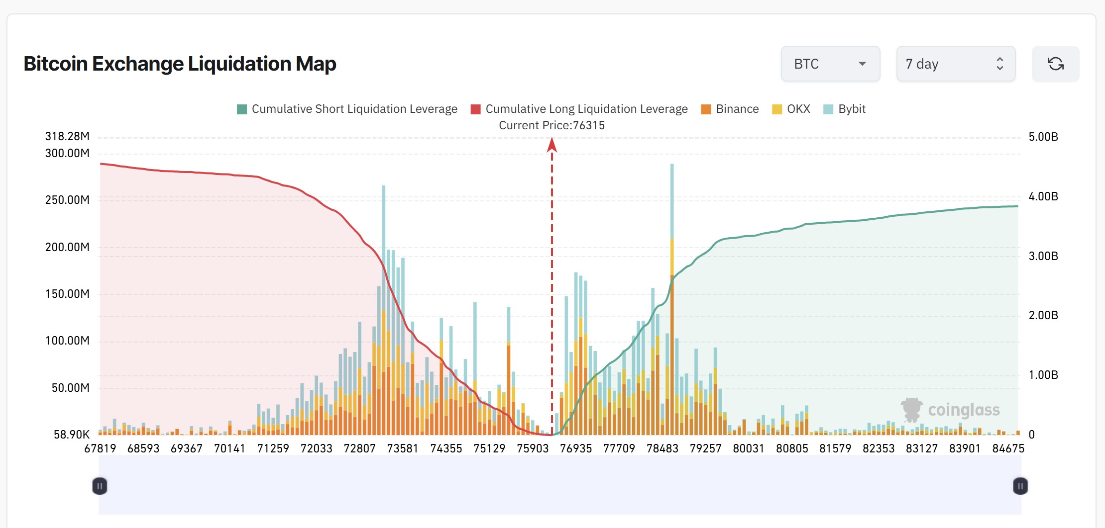 La liquidez permanece concentrada por debajo, con cerca de USD 2.800 millones en posiciones apalancadas acumuladas entre los USD 73.000 y USD 75.000, formando un rango de soporte. La oferta superior cerca de los USD 76.000 a USD 78.000 se sitúa en torno a los USD 1.800 millones en posiciones cortas apalancadas.