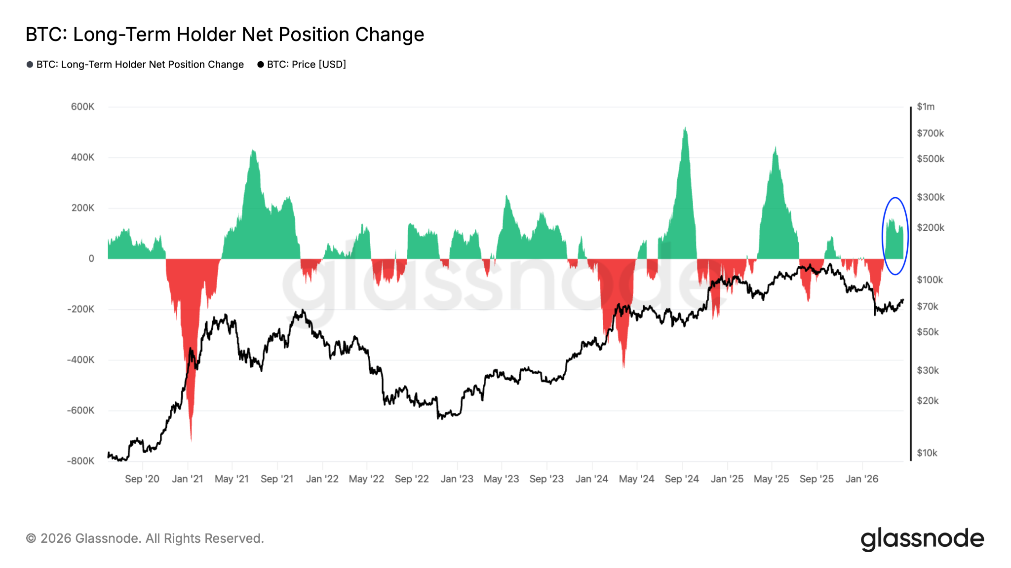 El cambio neto en la posición de LTH ha sido positivo desde el 1 de marzo, con alrededor de 130.000 $BTC comprados en los últimos 30 días.