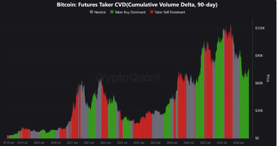 El delta de volumen acumulado de tomador de futuros de 90 días (CVD), una métrica que mide la diferencia entre el volumen de compra y venta durante un período de tres meses, refuerza aún más esta imagen.