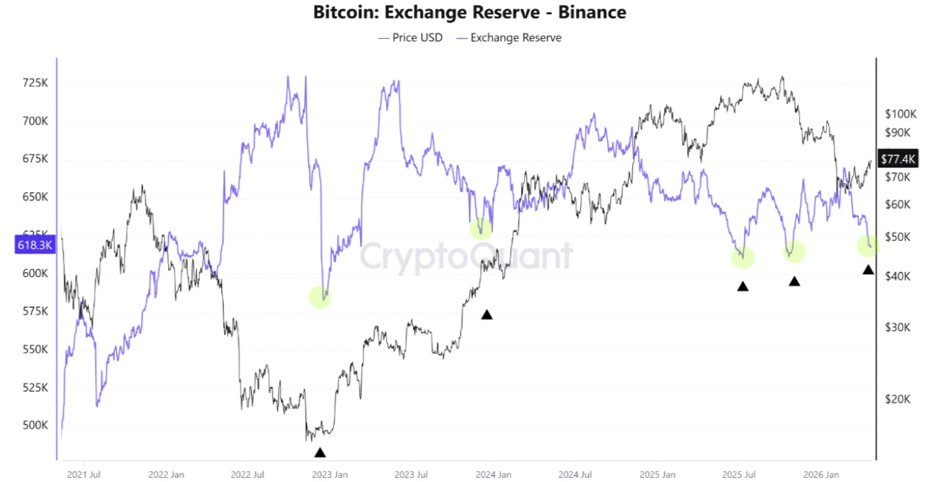 Los datos de reserva de exchange de CryptoQuant destacaron signos de reducción de la oferta, ya que el saldo de $BTC en Binance "sigue disminuyendo significativamente."