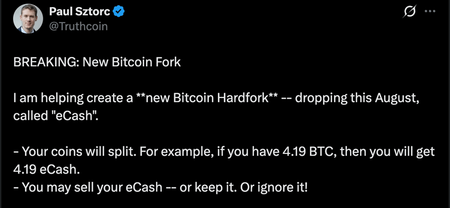 Los holders de Bitcoin podrán intercambiar sus $BTC por eCash en una proporción de 1:1 una vez que el hard fork esté activo, dijo Sztorc en una publicación de X.