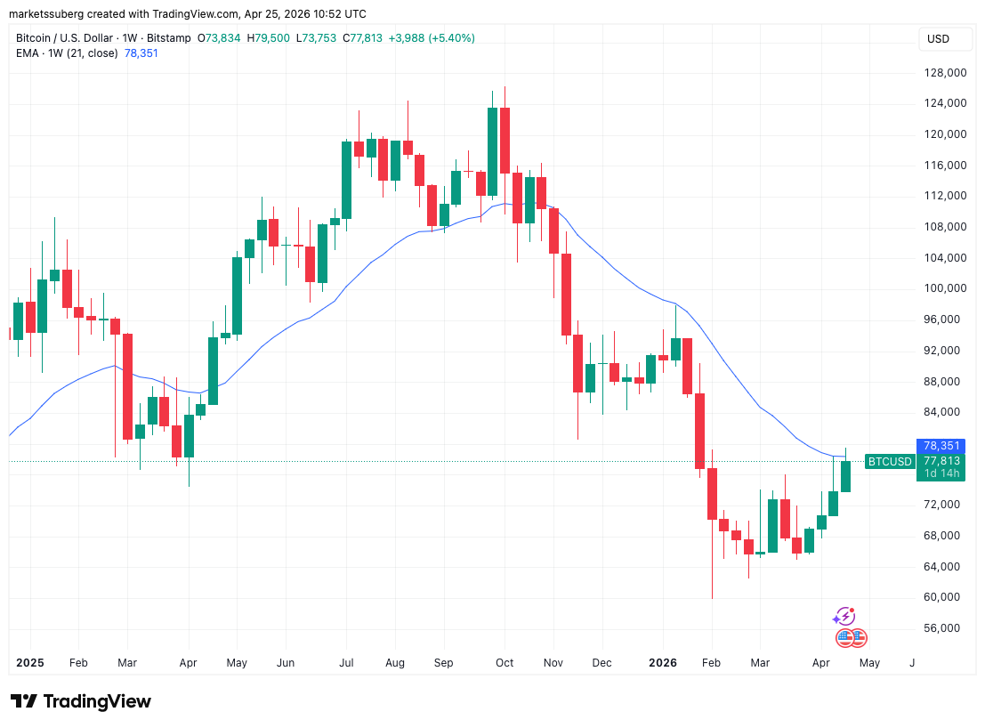 La media móvil, por debajo de la cual $BTC/USD ha cotizado desde octubre de 2023, se situaba en 78.400 dólares el día.