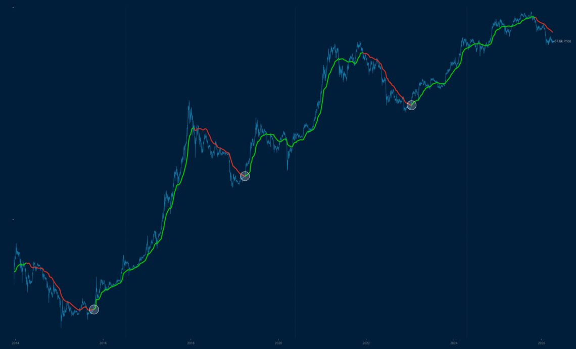 Además, los círculos grises marcan puntos de inflexión en los que el mercado intenta cambiar de tendencia. Según Woo, estos momentos han coincidido históricamente con el final de mercados bajistas, cuando el precio logra recuperar y sostener niveles clave.