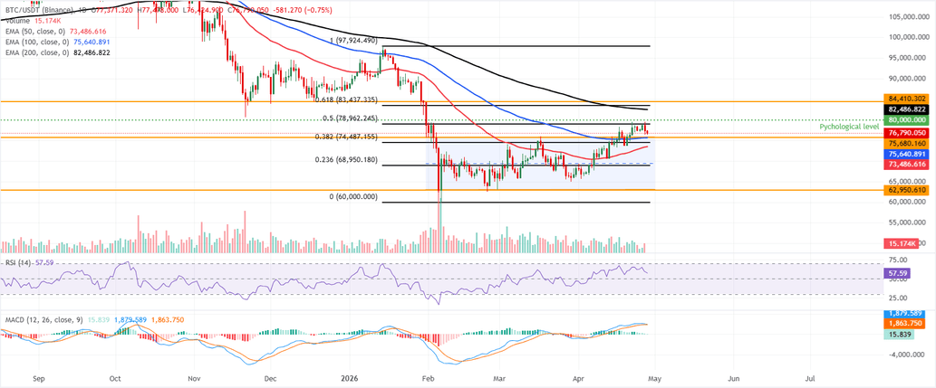El precio del Bitcoin cotiza a la baja cerca de 76.800$ el martes tras caer ligeramente el día anterior. El $BTC mantiene un sesgo alcista constructivo al mantenerse por encima de las medias móviles exponenciales (EMAs) de 50 y 100 días, situadas alrededor de 73.486$ y 75.640$, respectivamente, mientras también se apoya en el límite superior del canal paralelo, cuyo techo ahora ofrece soporte cercano en torno a 75.680$.