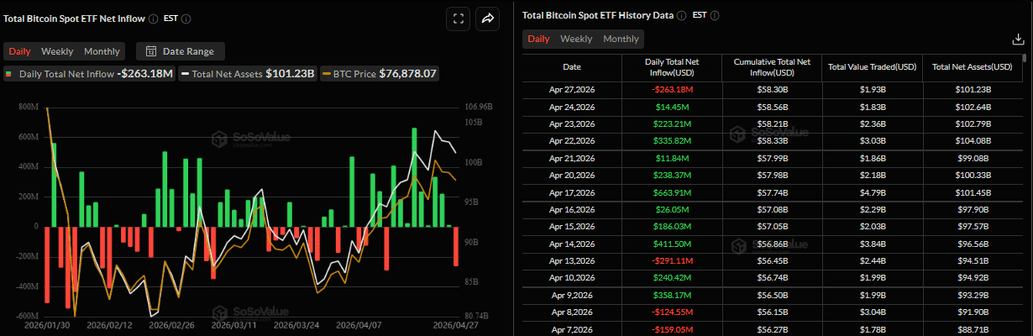 La demanda institucional comenzó la semana con cautela. Los datos de SoSoValue muestran que los ETF de Bitcoin al contado registraron una salida de 263.18 millones de dólares el lunes, rompiendo una racha de nueve días de flujos positivos desde mediados de abril. Los operadores deben ser cautelosos, ya que si esta tendencia de salidas continúa y se intensifica esta semana, el $BTC podría experimentar correcciones adicionales en su precio.