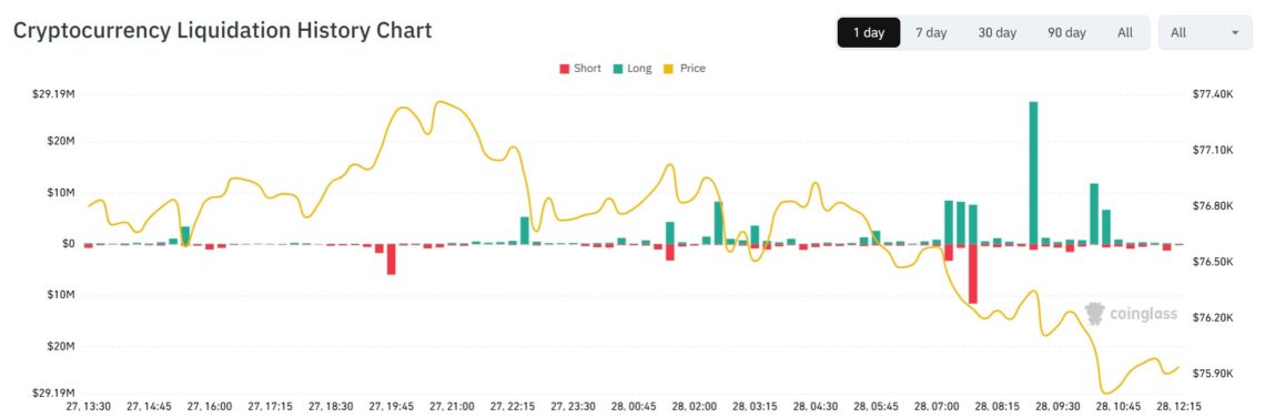 El precio de bitcoin ($BTC) sufrió una caída este 28 de abril de 2026 que lo llevó por debajo del soporte de los 76.000 dólares. Este movimiento provocó la liquidación de traders apalancados con posiciones alcistas en $BTC y criptomonedas por un total de 130 millones de dólares en las últimas 24 horas.