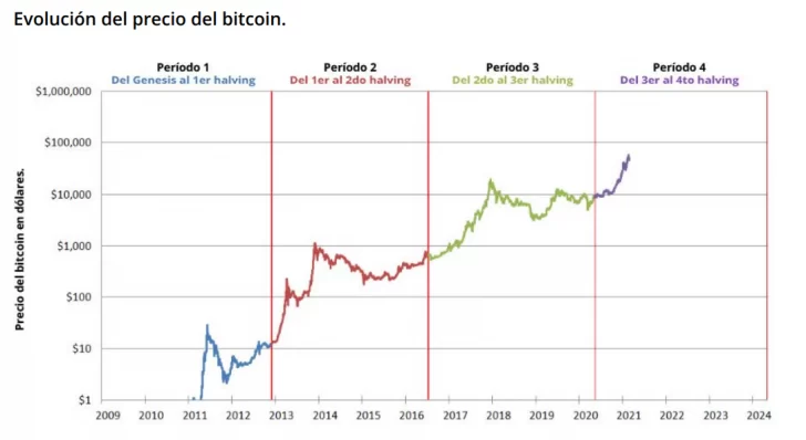 Desde que se empezara a comerciar con BTC, en 2010, la emisión de Bitcoin ha atravesado cuatro halvings —una reducción del 50% de la remuneración a los mineros. Graficando el historial de precios se visualizan claramente estos 4 ciclos con sus picos de precio y fuertes correcciones. También se podría describir el tipo de inversor que se fue sumando en cada ciclo o época.