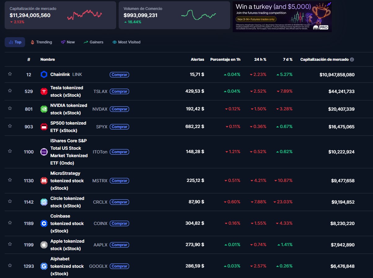 En la siguiente tabla de CoinMarketCap se aprecia el top 10 de las acciones tokenizadas más valuadas: