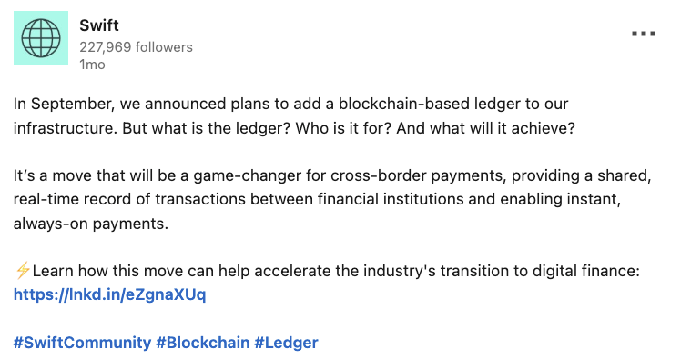 SWIFT había anunciado sus planes de "añadir un libro mayor basado en blockchain a su infraestructura" en septiembre de 2025.
