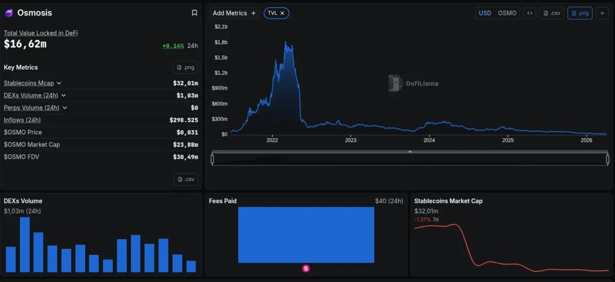 Otros proyectos como Penumbra, Osmosis y Noble, llevan meses sin desarrollo, y su uso dentro de la red Cosmos es prácticamente inexistente. Y podemos usar cualquier métrica para verlo. Por ejemplo, el TVL de Osmosis (un DEX) no llega a superar los 16 millones de dólares, lejos de su grandeza en 2022, cuando el proyecto alcanzó los 1,7 mil millones de dólares.