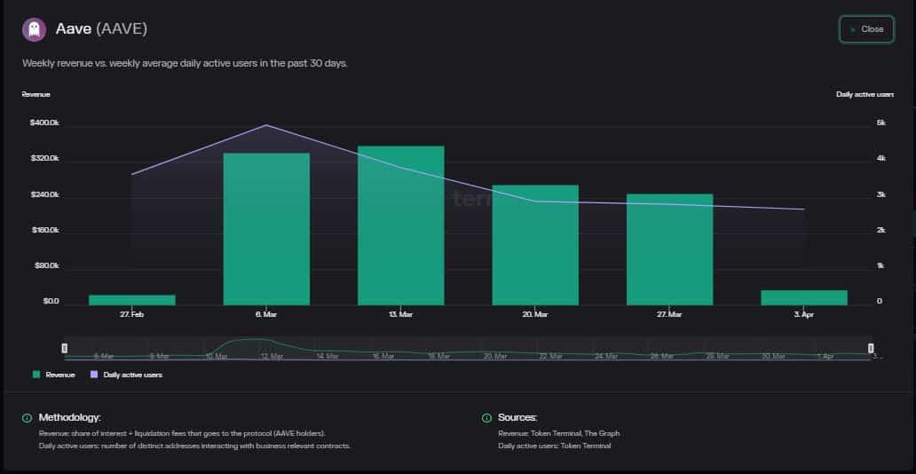 El TVL promedio mensual de Aave para marzo aumentó un 10%. Los ingresos en la última semana de marzo cayeron un 8% con respecto a la semana anterior. Los fondos totales depositados en el protocolo de préstamos y préstamos DeFi, Aave [$AAVE], creció constantemente desde principios de 2023. Según Token Terminal, el valor total promedio mensual bloqueado (TVL) para marzo aumentó un 10 % con respecto a los datos del mes anterior y hasta un 18 % con respecto a enero. Además, el token de gobernanza del ecosistema, $AAVE, exhibió un notable crecimiento anual hasta la fecha (YTD) del 42 % y una expansión semanal de más del 10 %, según los datos de CoinMarketCap.