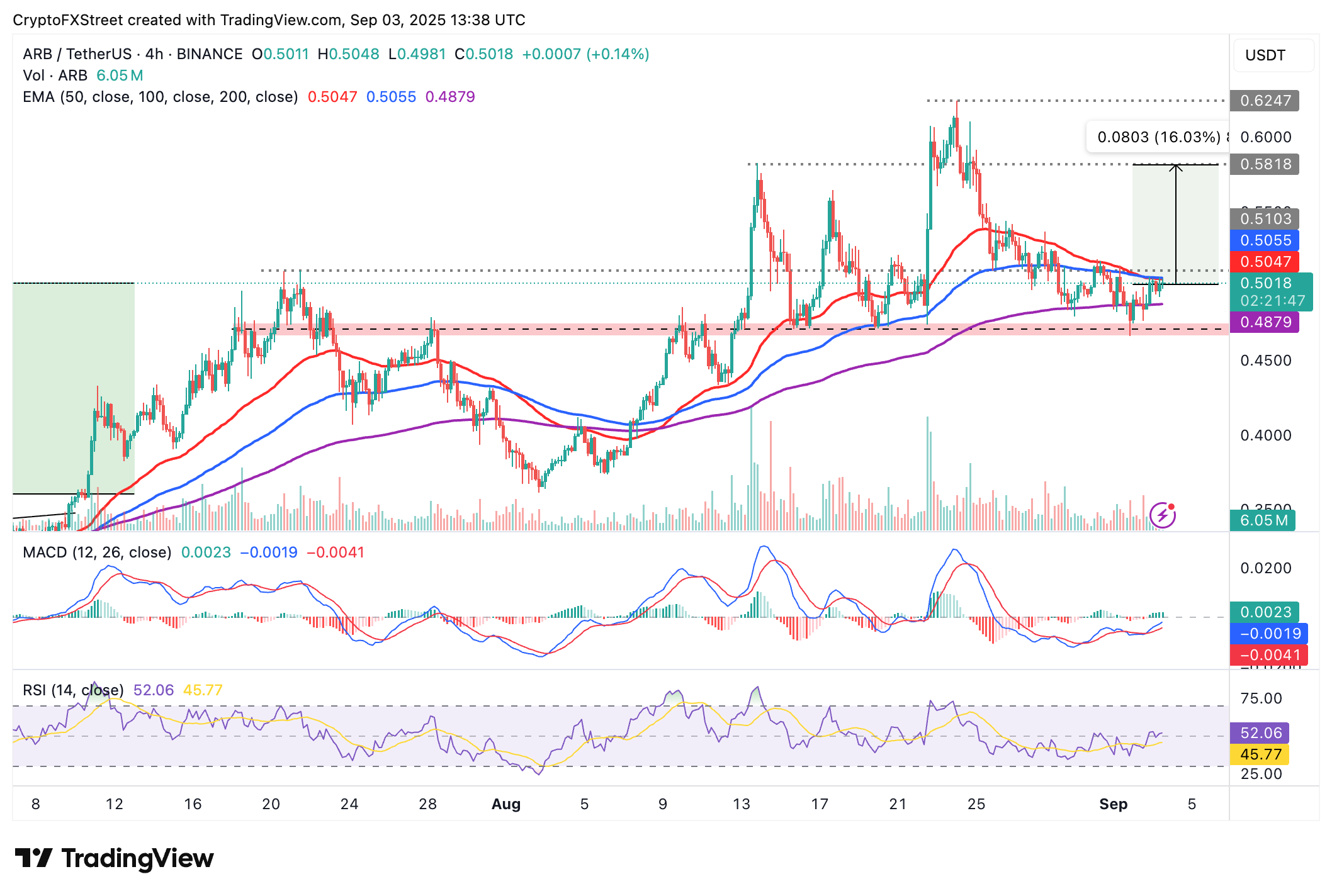 El precio de Arbitrum se mantiene por encima de una confluencia establecida por la media móvil exponencial (EMA) de 50 periodos y la EMA de 100 periodos en 0.50$ en el gráfico de 4 horas.