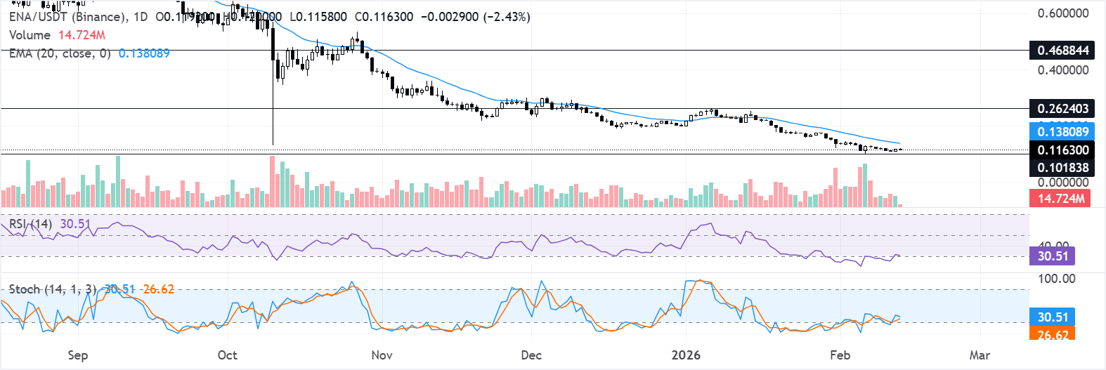 Ethena ($ENA) se cotiza alrededor de 0.116$ el viernes, registrando un aumento del 6% anteriormente antes de reducir algunas de esas ganancias en las últimas 24 horas.