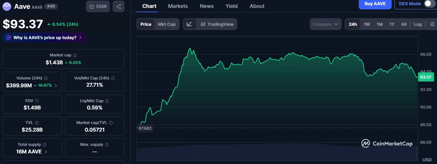 Actualmente, $AAVE cotiza en torno a los 93,4 dólares crisis de gobernanza en el primer trimestre que provocaron la salida de BGD Labs y Aave Chan Initiative (ACI).