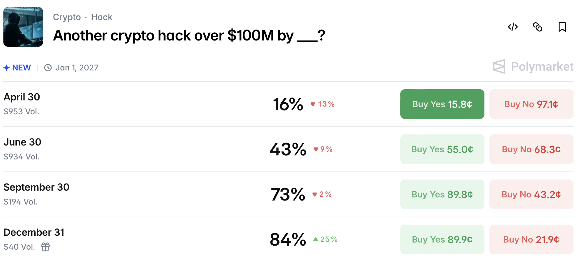 Probabilidades de otro hack de criptomonedas de más de 100 millones de dólares. Fuente: Polymarket