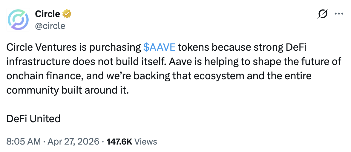 Por separado, Circle dijo el lunes que su brazo de capital de riesgo está comprando tokens AAVE para apoyar el protocolo y el ecosistema DeFi en general.