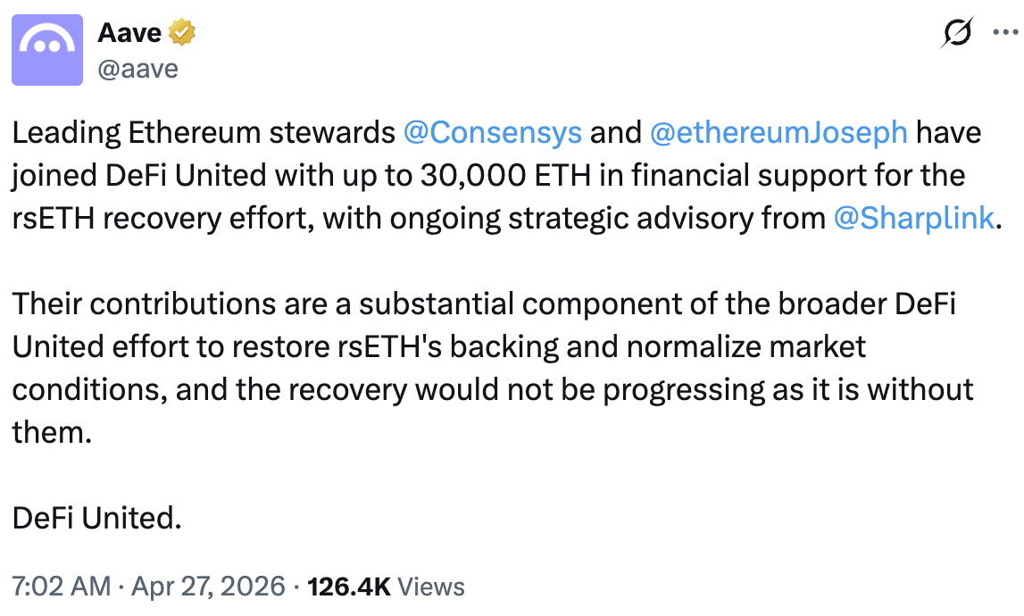 Consensys y el cofundador de Ethereum, Joe Lubin, se han unido a DeFi United, destinando hasta 30.000 ETH para un esfuerzo de recuperación destinado a restaurar el respaldo de rsETH después de un exploit de puente de 290 millones de dólares que provocó interrupciones generalizadas en DeFi.