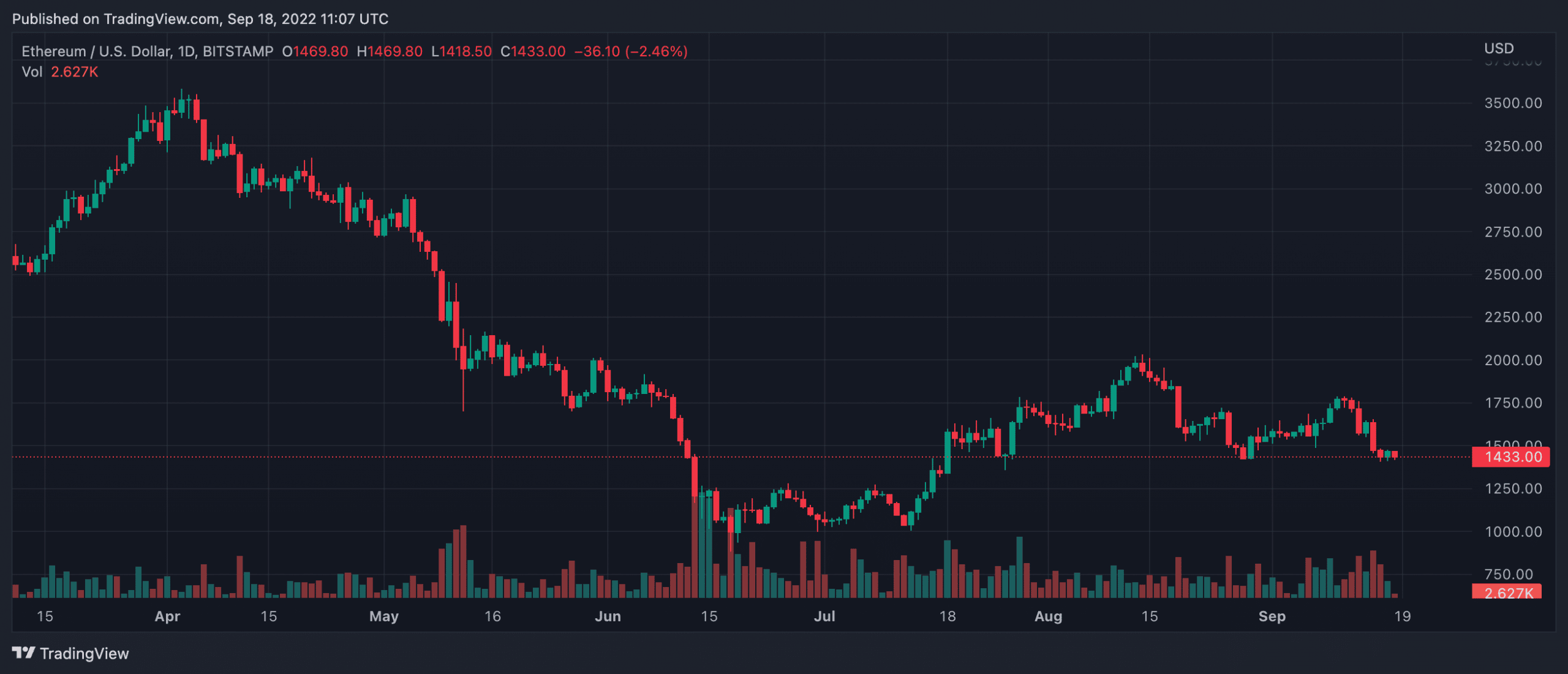 Sin embargo, una mirada a los gráficos nos da una visión más completa de cómo está el mercado. Por ejemplo, ETH, en el momento de la publicación, cotizaba a su nivel de precios de hace tres semanas. Esto, solo porque en los últimos días la altcoin tuvo una tendencia a la baja después de la fusión.