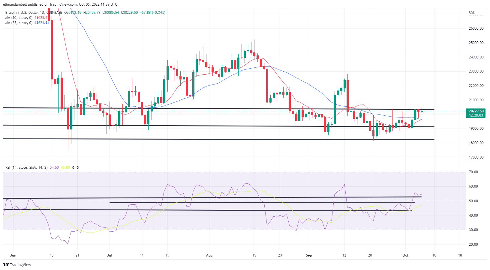 Al momento de escribir, BTC is now trading marginally below its long-term support level of $20,300, which has mostly been in place since September 13.