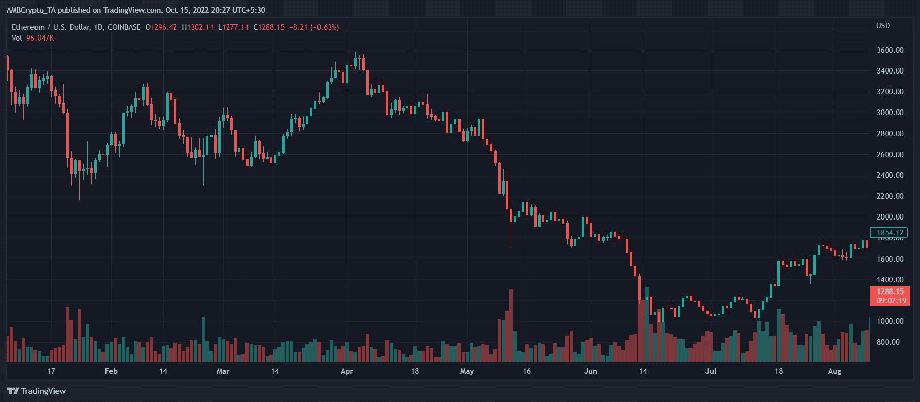 En 2022, el precio inicial de Ethereum fue $ 3,722.59. Ethereum, en el momento de la publicación, cotizaba a 1,299.22, más de ~ 65% desde su máximo del año hasta la fecha ($3,850 a principios de enero de 2022). Gracias a su alto ROI, los primeros inversores han triplicado sus inversiones anualmente. ETH, en el momento de la publicación, tenía una capitalización de mercado de 159.5 millones de dólares.