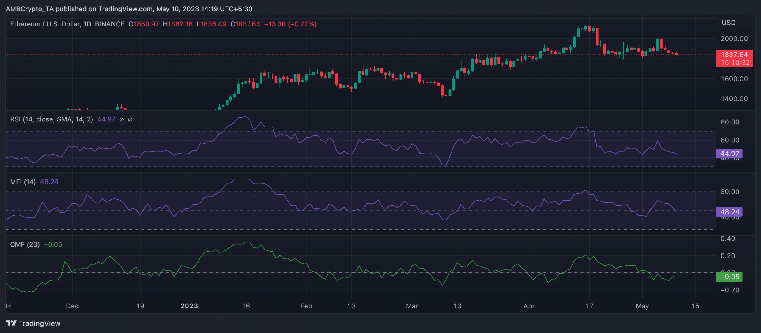 Fuente: Dune Analytics ETH en un gráfico diario En el momento de la publicación, la altcoin líder cotizaba a $1.836,81. Cayendo desde un máximo de $2008 el 6 de mayo, la presión de venta ha aumentado desde entonces. En un gráfico diario, los indicadores clave de impulso se ubicaron por debajo de sus respectivos puntos neutrales, lo que indica que la presión de venta superó la presión de compra. Por ejemplo, el índice de fuerza relativa (RSI) de ETH fue de 44,97. Asimismo, su Índice de Flujo de Dinero (IMF) fue de 48,24. También debajo de su línea central estaba el Chaikin Money Flow. A -0,05 en el momento de escribir este artículo, ETH experimentó una salida de liquidez, lo que podría hacer que su precio cayera aún más.