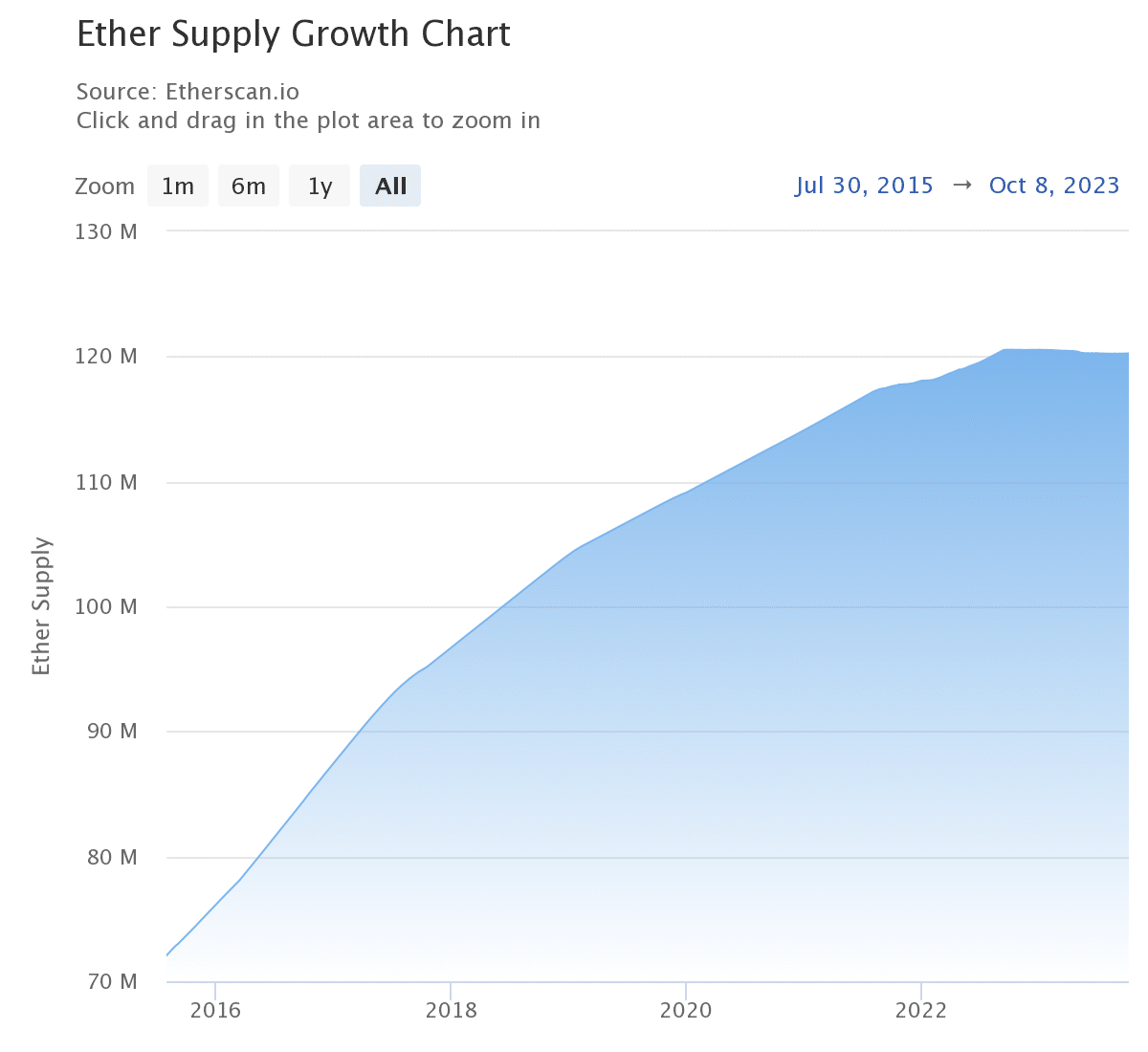 El 2023 se abrió con una oferta circulante de unos 120,5 millones de $ETH, y en junio había caído a poco más de 120,2 millones. Es decir, la primera mitad de 2023 se cerró con una inflación negativa de la oferta monetaria de $ETH de alrededor del -0,25%. El pico más bajo de 2023 se produjo en agosto, con menos de 120,22 millones de $ETH en circulación.
