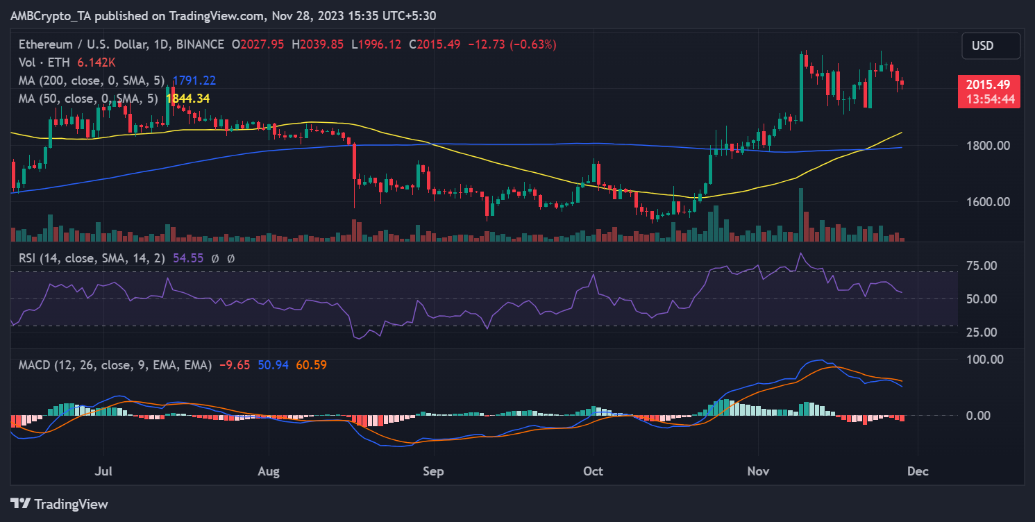 Al momento de escribir este artículo, Ethereum cotizaba a alrededor de $2015, experimentando una ligera caída de menos del 1% en valor.
