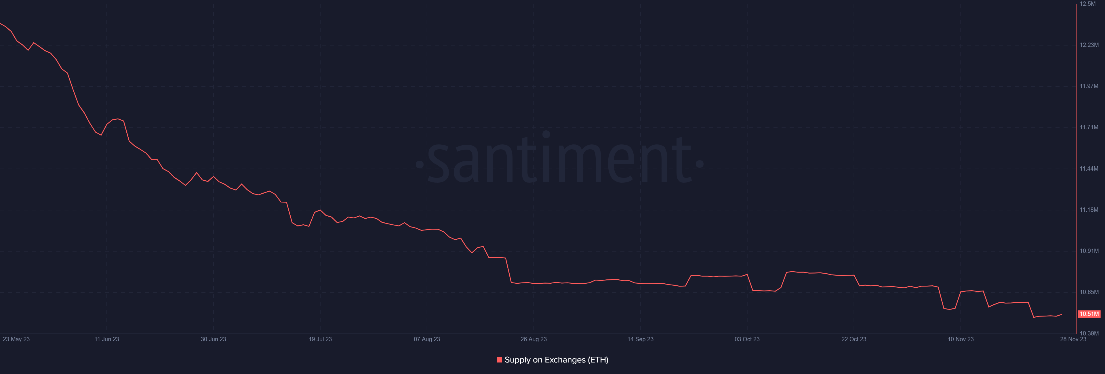 Fuente: CryptoQuant En particular, este fue el primer flujo neto positivo en los últimos cinco días. Además, fue el primer día consecutivo con un flujo neto positivo en los últimos días. La oferta continúa cayendo El examen de CriptoPasion de la oferta de intercambio de Ethereum en Santiment mostró un patrón consistente, a pesar de un reciente aumento en la entrada de intercambio en las últimas 48 horas. El gráfico reveló que la oferta en las bolsas se mantuvo estable en alrededor de 10,51 millones al momento de esta edición. Esta cifra representó aproximadamente el 8,1% del suministro total de ETH. En particular, a pesar del reciente aumento de la entrada de divisas, el movimiento significativo más reciente reflejó una disminución de la oferta.