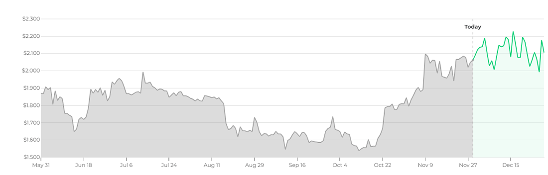 Al momento de redactar, el precio de la moneda se encuentra en el segundo mejor momento del año. De tal modo, desde que empezara noviembre, el token muestra resultados que solo son superados por los experimentados a mediados de abril. En tanto, el precio de la moneda es de $2.056 dólares por unidad, con un interanual de 61.9%, según datos de CoinGecko.