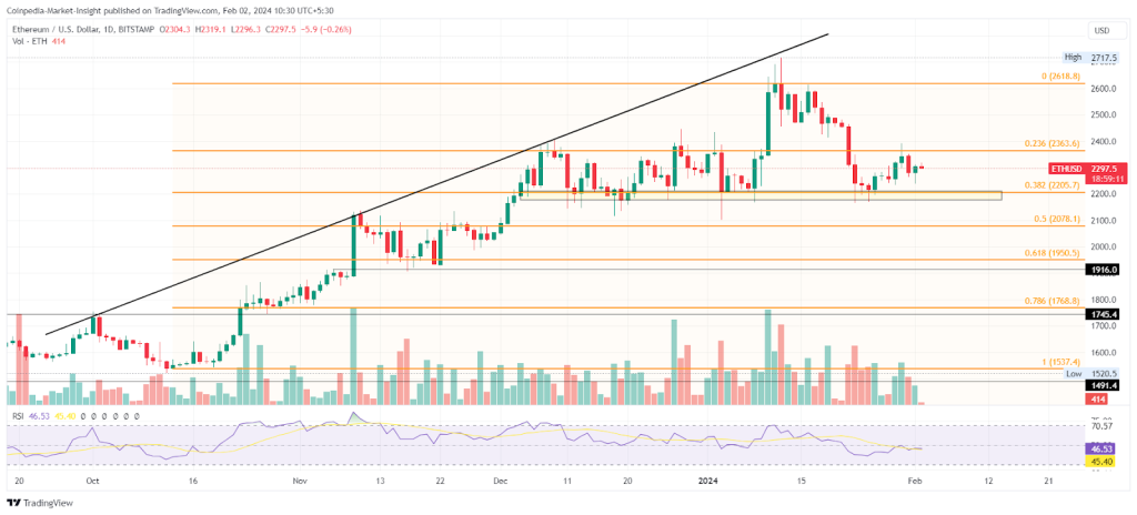 Al retroceder desde la línea de tendencia de resistencia superior, la fase de retroceso en el precio de Ethereum encuentra apoyo en el nivel de Fibonacci del 38,20%. Ethereum demuestra resistencia por encima del umbral psicológico de los $2.000, reforzado por una zona de demanda en los $2.200.