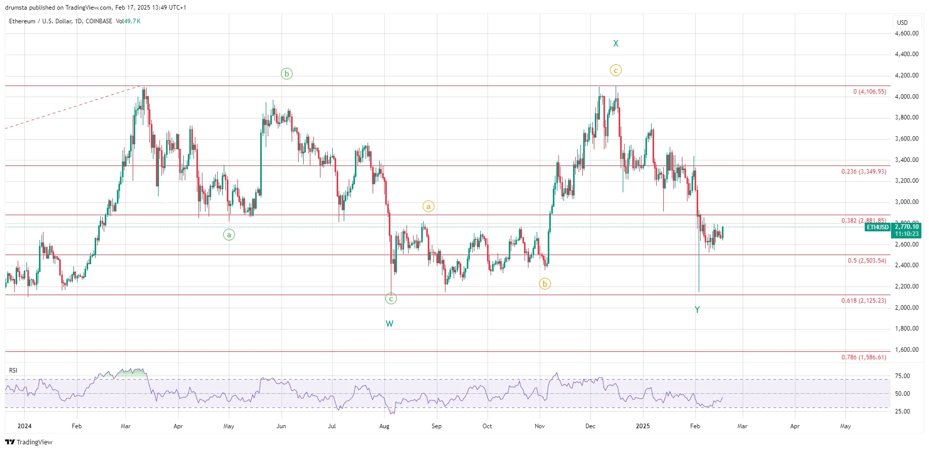 El gráfico de precios diario revela que Ethereum entró en una fase de corrección después de alcanzar los $4,100 el 11 de marzo. El conteo de ondas de Elliott indica que el precio comenzó a recuperarse después de una caída a $2,150 el 3 de febrero.