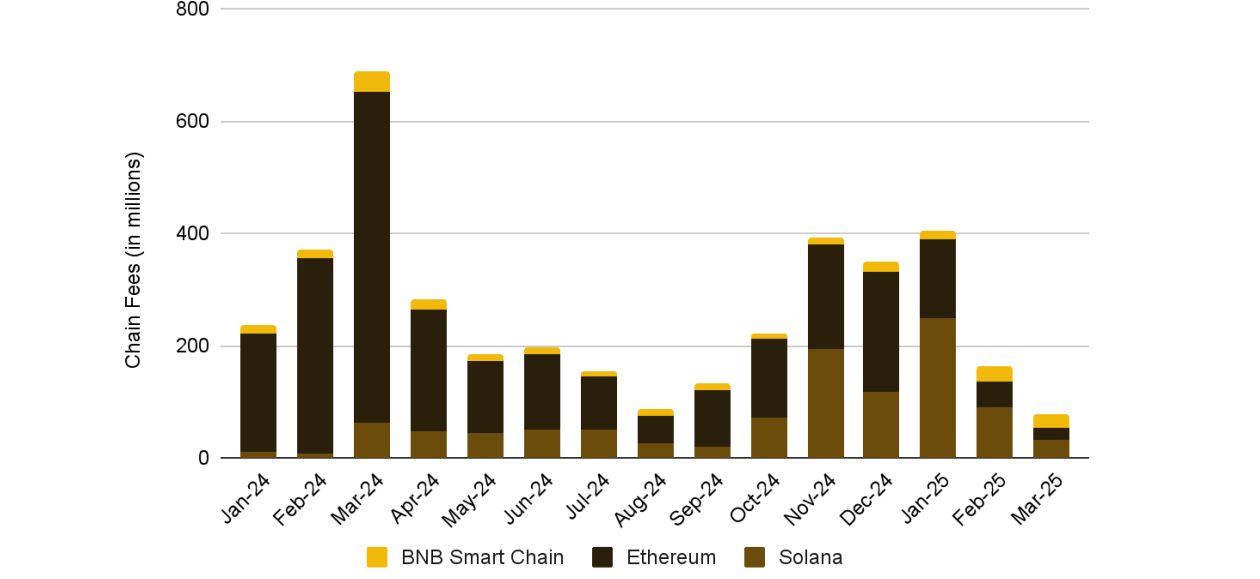 La actualización vio a los L2 mejorar su rendimiento y reducir significativamente los costos mientras pagaban comisiones insignificantes por la liquidación en L1. Esto ha perjudicado la acumulación de valor de ETH y la narrativa de "dinero ultrasónico", que depende en gran medida de las comisiones de gas. Como resultado, Ethereum está perdiendo terreno frente a Solana y BNB Chain en términos de comisiones capturadas.