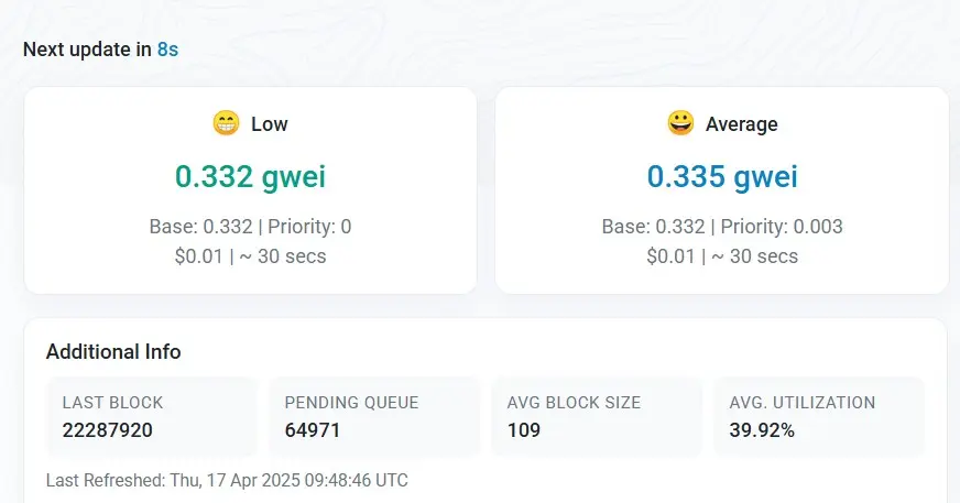 A medida que la incertidumbre económica se asoman, los comerciantes están agarrando sus estables mientras se mantienen cauteloso. Pero aquí está el pateador, las tarifas bajas a menudo se colocan justo antes de los grandes movimientos. Los datos muestran que las tarifas de gas promedio sobre la cadena Ethereum se encuentran en 0.335 GWEI, que es de aproximadamente $ 0.02.