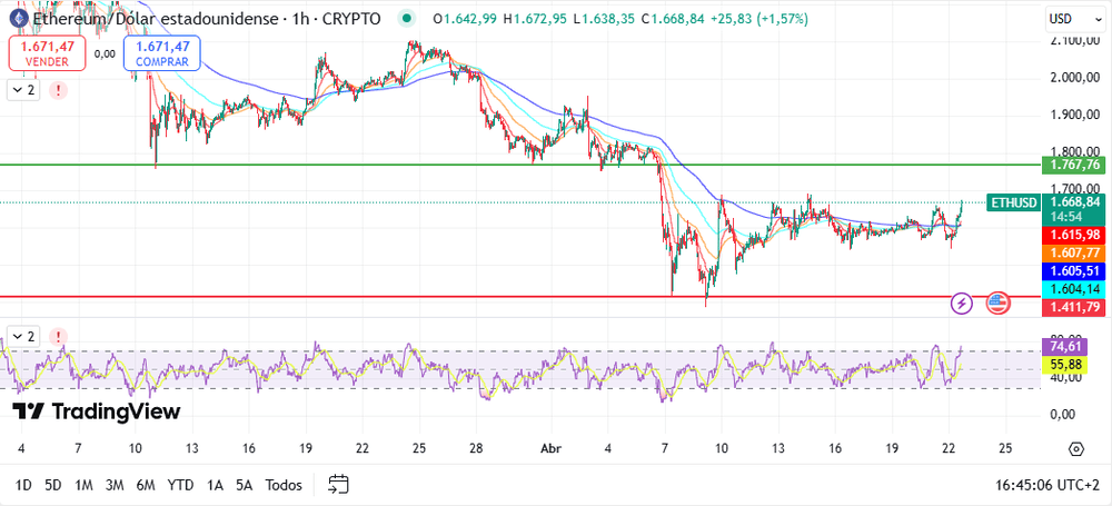- $1.411: soporte importante cuya pérdida podría llevar a ETH hacia los $1.200.