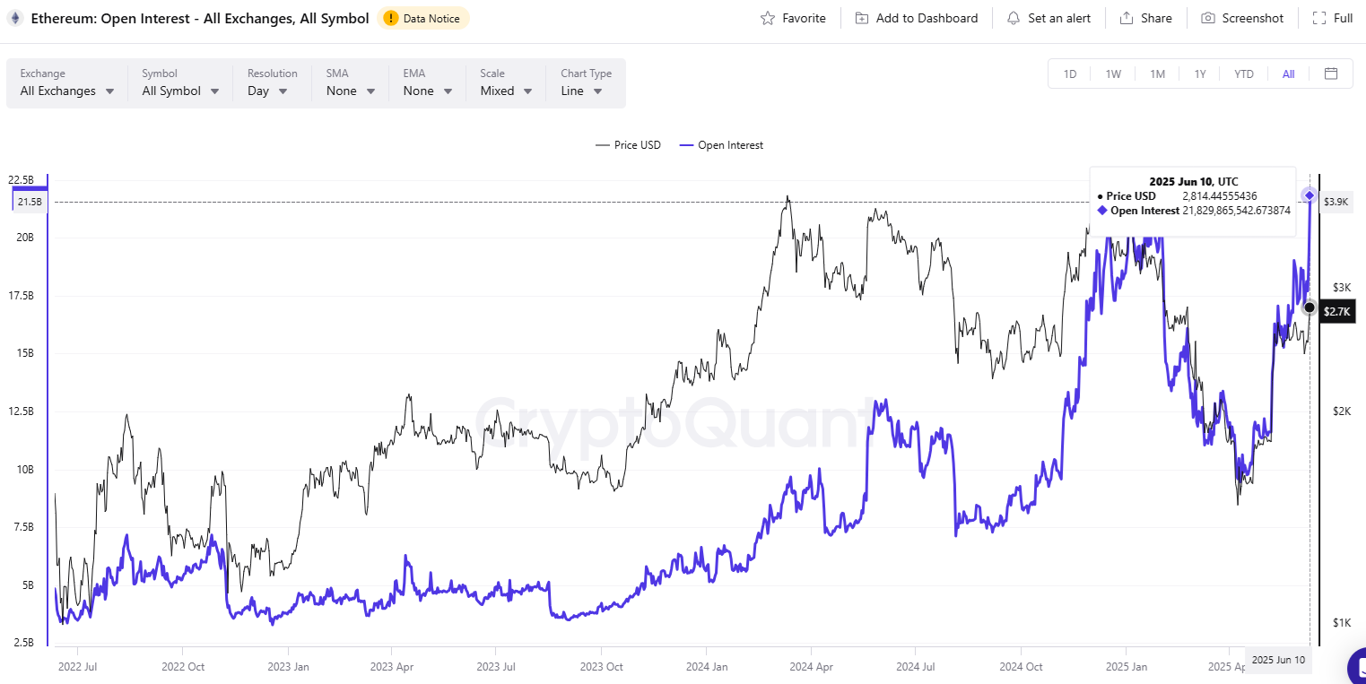 Según los datos criptoquantes, el futuro ETH apunta al más alto nivel de especulación, mientras que las ballenas todavía se aferran a ETH en sus billeteras autododiadas. Interés abierto sobre intercambios derivados flotan alrededor de $ 22B, o 7.17m ETH.
