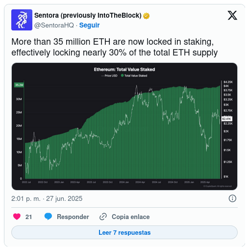 Ethereum ha entrado en una fase crítica en su transición a un modelo basado en staking, cruzando un umbral importante con más de 35 millones de ETH ahora bloqueados en contratos de staking.