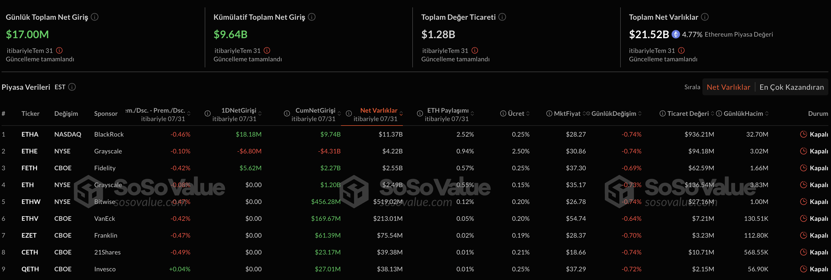 Con las crecientes entradas, el valor de los activos bajo gestión para los ETFs de Ethereum ha alcanzado los $21.52 mil millones, representando el 4.77% de la oferta total. Los analistas sugieren que esta cifra indica un flujo continuo de fondos hacia Ethereum sin imponer presión adicional sobre la rentabilidad de la cadena de bloques.